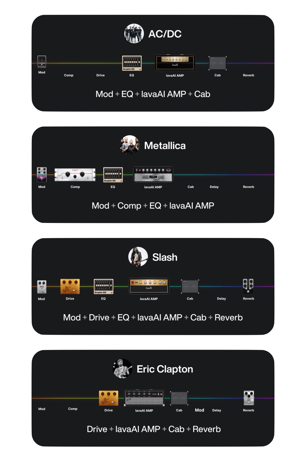 Никаких проводов. Выбирай усилители и настраивай модуляции в режиме реального времени одним касанием, прямо на экране твоей LAVA STUDIO.